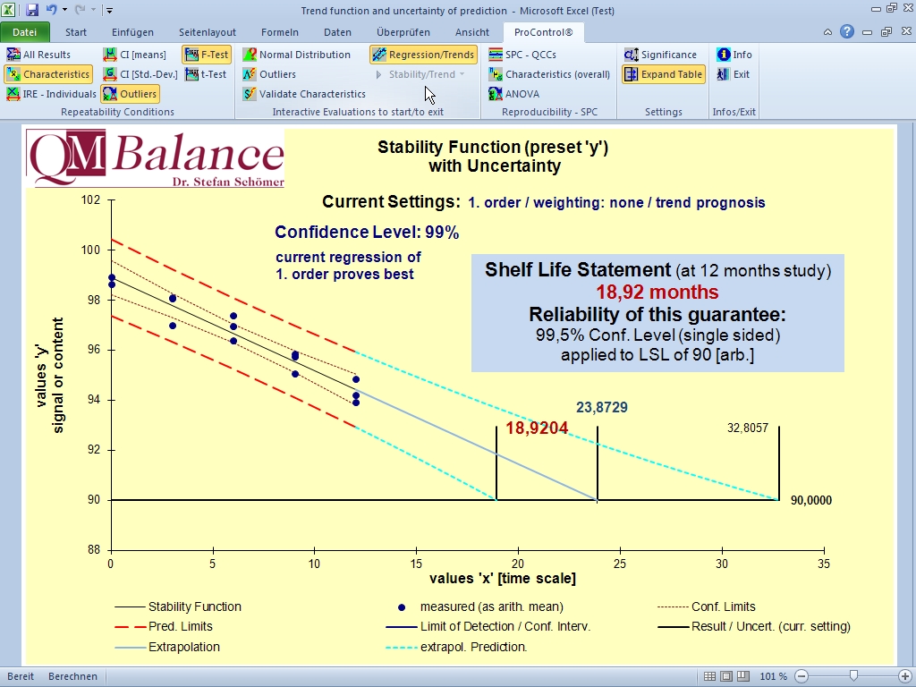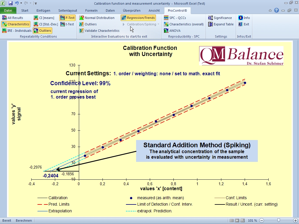 - Results display graphicallyCurrent measurements, calibration function with confidence and prediction